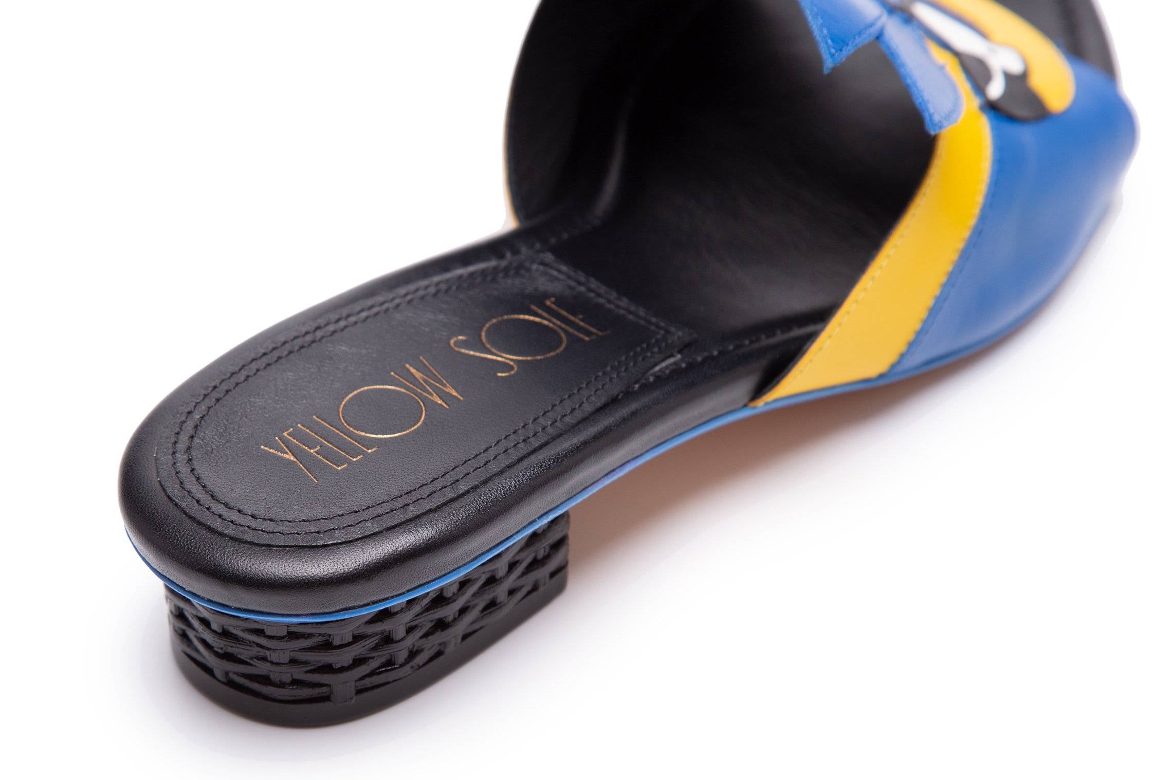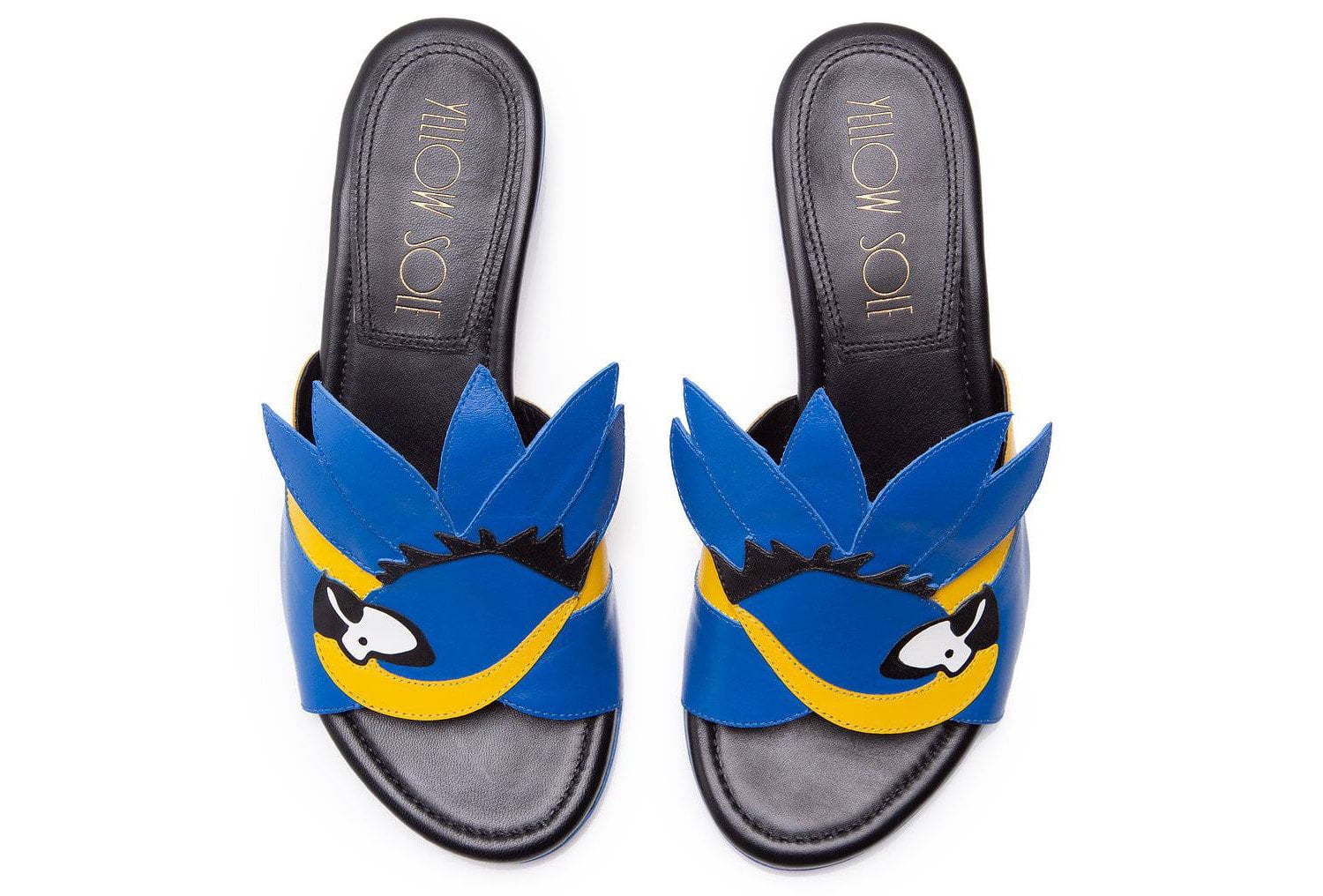 A mule flat é elaborada em couro de cabra com acabamento acetinado, recortado e montado com a sobreposição de peças que juntas trazem a figura da Arara Azul Rio. Tem seu salto de 2.5 cm forrado em palha natural pintada.