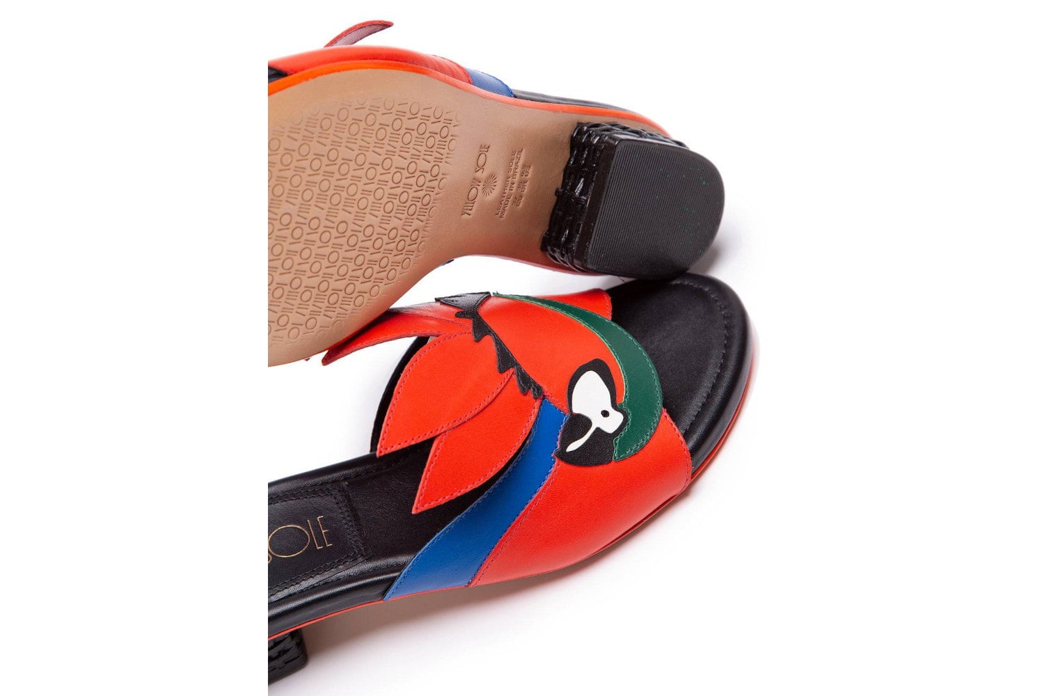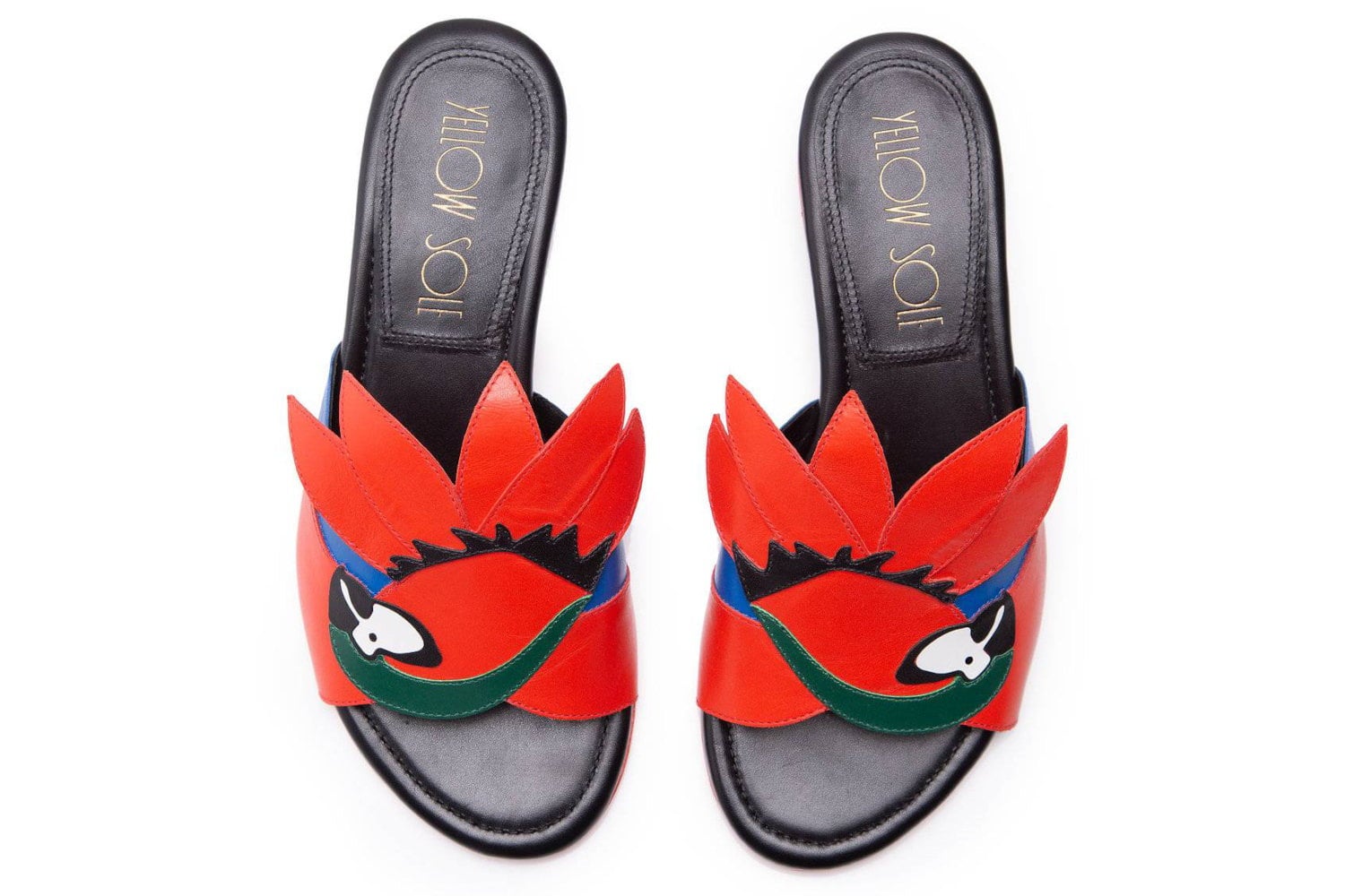 A mule flat é elaborada em couro de cabra com acabamento acetinado, recortado e montado com a sobreposição de peças que juntas trazem a figura da Arara Vermelha. Tem seu salto de 2.5 cm forrado em palha natural pintada.