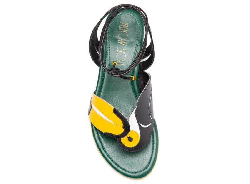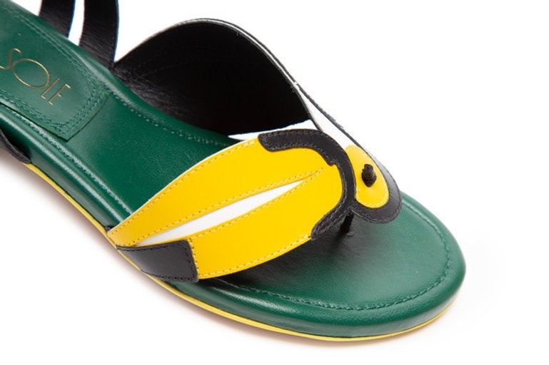 A sandália flat com amarração na perna é elaborada em couro de cabra com acabamento acetinado, recortado e montado com a sobreposição de peças que juntas trazem a figura do Tucano. Tem seu salto de 2.5 cm forrado em palha natural pintada.