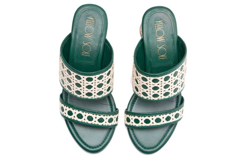 A mule de 2 tiras é elaborada em couro de cabra cor verde com acabamento acetinado e tem a – sobreposição do trançado de palha natural. Seu salto cone de 5.5 cm é forrado em palha natural.