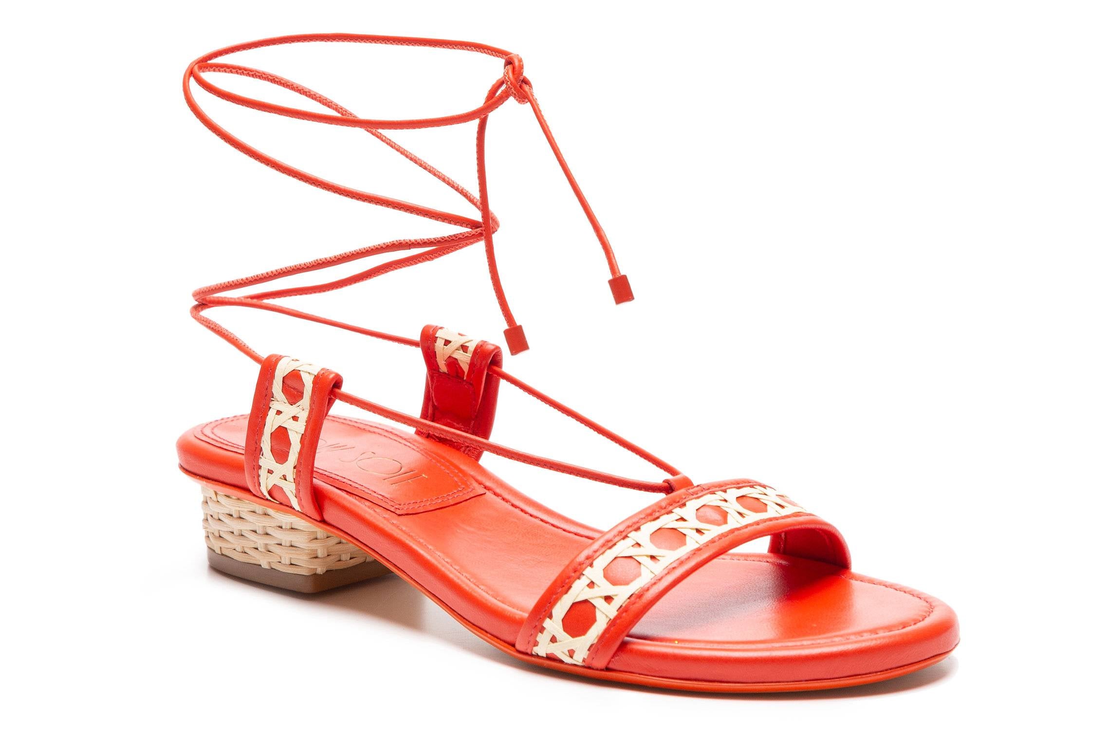 A sandália flat com amarração na perna é elaborada em couro de cabra cor vermelho com acabamento acetinado e tem a sobreposição do trançado de palha natural. Seu salto de 2.5 cm é forrado em palha natural.