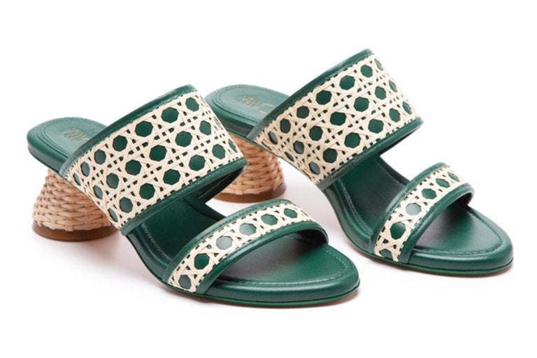 A mule de 2 tiras é elaborada em couro de cabra cor verde com acabamento acetinado e tem a – sobreposição do trançado de palha natural. Seu salto cone de 5.5 cm é forrado em palha natural.